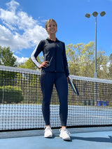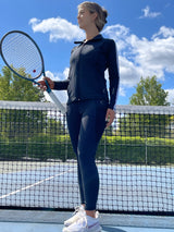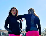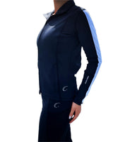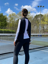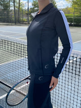 This sleek jacket features a full zip with two zippered side pockets and convenient thumb holes for improved fit and motion. A breathable mesh trim lines the side arms and back. The mesh trim is featured in black, rich grey, or white. This jacket is constructed with our finest performance fabric for exceptional comfort and elegance.