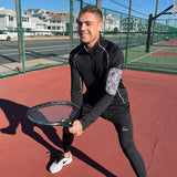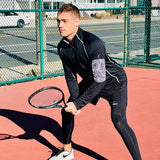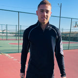 This buttery soft tailor fitted quarter zip jacket delivers performance and prestige. Superior stretch, and moisture wicking benefits keep you comfortable and confident far beyond the final point. It is finished with a mock collar, contrast grey stitching and a patterned sleeve pocket with zipper to carry small essentials.